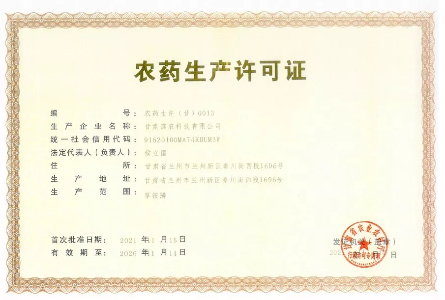 最終,甘肅濱農(nóng)順利通過草銨膦原藥農(nóng)藥生產(chǎn)許可審查并取得農(nóng)藥生產(chǎn)許可證(證號(hào)為農(nóng)藥生許(甘)0013),進(jìn)一步夯實(shí)了公司生產(chǎn)基礎(chǔ),為濱農(nóng)戰(zhàn)略發(fā)展再添強(qiáng)勁動(dòng)力。