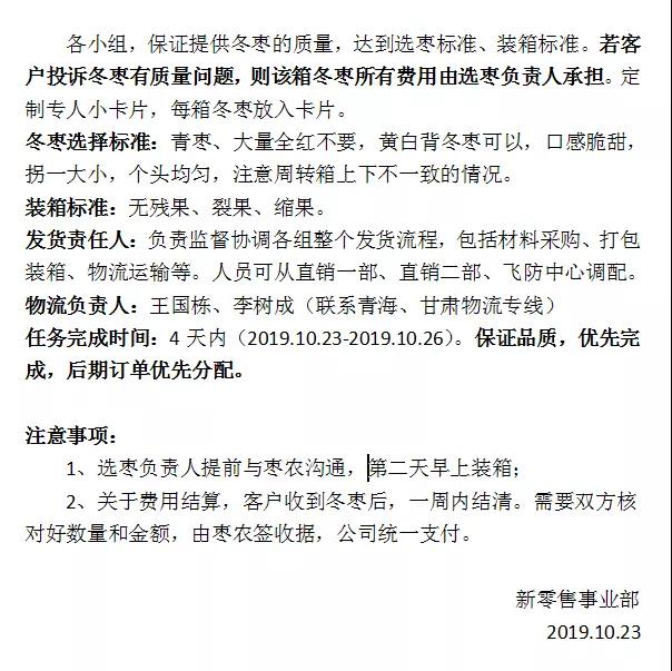 分工協(xié)作加上同事們高昂的工作勁頭,極大地提高了工作效率,歷時(shí)三天,萬(wàn)箱經(jīng)過(guò)層層篩選的冬棗順利發(fā)出。物流承載的不僅僅是棗,更是新零售事業(yè)部全體人員的努力付出,在這三天里,有同事早晨來(lái)不及吃早飯,只能擠出時(shí)間吃個(gè)包子,公益服務(wù),卻也視為責(zé)任!