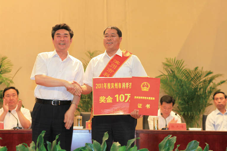 我公司董事長(zhǎng)黃延昌榮獲2011年濱州市科學(xué)技術(shù)最高獎(jiǎng)發(fā)布時(shí)間:2014-06-16 10:332012年3月19日,濱州市人民政府濱政字【2012】22號(hào)文件《關(guān)于2011年度濱州市科學(xué)技術(shù)獎(jiǎng)勵(lì)的決定》公布了2011年獲得濱州市科學(xué)技術(shù)獎(jiǎng)勵(lì)的單位和個(gè)人。我公司董事長(zhǎng)黃延昌喜獲2011年度“濱州市科學(xué)技術(shù)最高獎(jiǎng)”。 6月1日下午,在市政大廈隆重舉行的全市科學(xué)技術(shù)獎(jiǎng)勵(lì)大會(huì)上,董事長(zhǎng)黃延昌獲頒 “2011年度濱州市科學(xué)技術(shù)最高獎(jiǎng)”,并獲獎(jiǎng)金10萬元。 近幾年,我公司自主創(chuàng)新能力大幅提升,創(chuàng)新平臺(tái)建設(shè)步伐加快,為公司研發(fā)“高精尖”綠色農(nóng)藥提供了強(qiáng)力的技術(shù)支撐。特別是在農(nóng)藥合成及制劑的復(fù)配領(lǐng)域中均實(shí)現(xiàn)了重大創(chuàng)新與突破,為中國(guó)農(nóng)藥產(chǎn)業(yè)的發(fā)展壯大做出了重要貢獻(xiàn):系統(tǒng)研究了多種不對(duì)稱催化劑的合成方法,研發(fā)出多種手性化合物合成所用的不對(duì)稱催化劑,解決了手性化合物合成中的關(guān)鍵、共性問題,開發(fā)出5個(gè)農(nóng)藥原藥新產(chǎn)品,填補(bǔ)了國(guó)內(nèi)空白。首創(chuàng)了多個(gè)多元復(fù)配制劑配方,解決了國(guó)內(nèi)部分農(nóng)作物田間農(nóng)藥品種少、成本高的難題,增添了農(nóng)藥新品種,提高了在國(guó)內(nèi)農(nóng)藥行業(yè)的市場(chǎng)競(jìng)爭(zhēng)力。 ![]() |