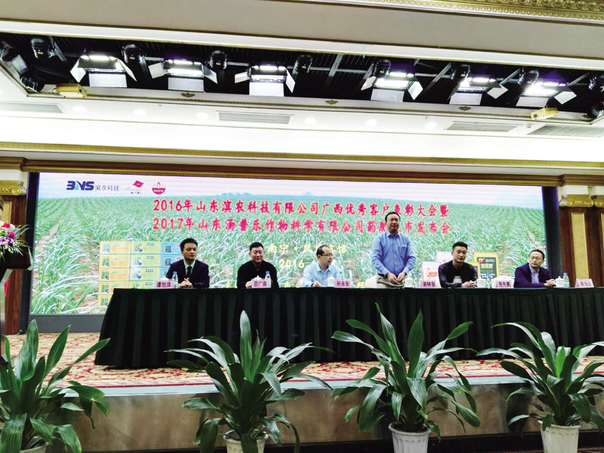 我公司甘蔗田新產(chǎn)品推介會 暨優(yōu)秀客戶表彰大會在廣西南寧順利召開發(fā)布時間:2016-12-31 14:2212月3-5日,由我公司主辦的兩場“甘蔗田新產(chǎn)品推介會暨優(yōu)秀客戶表彰大會”在廣西南寧順利召開,來自廣西各縣市級代理商和零售商共計500余人參加了會議。 兩場會議分別由南寧普得樂植保有限公司總經(jīng)理譚旭旗和南寧金子農(nóng)化有限公司總經(jīng)理梁祖旺主持。首先,我公司制劑副總助理孫永安介紹了濱農(nóng)的發(fā)展歷史及生產(chǎn)經(jīng)營情況;隨后,業(yè)務經(jīng)理王超就濱農(nóng)殺草得、好風度、十里坡、統(tǒng)混凈、濱農(nóng)蔗好、濱農(nóng)蔗得鋤、甘蔗樂精品、濱農(nóng)好時節(jié)精品等適用于廣西高糖、高產(chǎn)甘蔗的苗后產(chǎn)品進行了詳細講解;最后我公司銷售六處處長蔡海波針對甘蔗田雜草的發(fā)生現(xiàn)狀,雙高甘蔗品種除草劑使用的注意事項進行了講解,并公布了2017年甘蔗田除草劑的產(chǎn)品政策及冬儲優(yōu)惠政策。 通過這次會議,批發(fā)商和零售商充分了解了公司的甘蔗田產(chǎn)品特性和優(yōu)勢,大大提高了濱農(nóng)產(chǎn)品在廣西市場的品牌影響力,更堅定了今后合作的信心,客戶紛紛現(xiàn)場交款訂貨,訂貨量遠超預定目標。