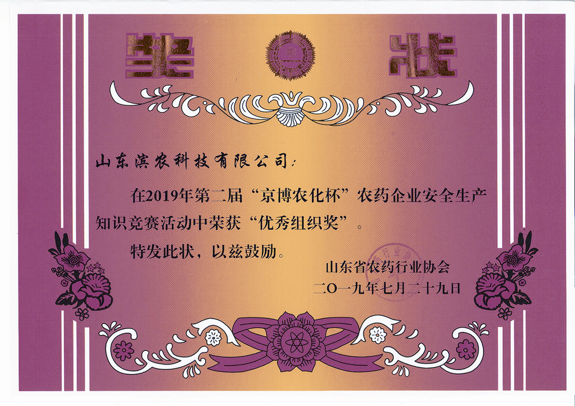 我公司榮獲第二屆“京博農化杯”農藥企業(yè)安全生產(chǎn)知識競賽“優(yōu)秀組織獎”發(fā)布時間:2019-09-05 14:19本報訊 6月,全省企業(yè)“安全生產(chǎn)月”活動期間,山東省農藥行業(yè)協(xié)會開展了第二屆“京博農化杯”農藥企業(yè)安全生產(chǎn)知識競賽,我公司安全部積極組織各生產(chǎn)車間共610人參加了競賽。此次競賽共有42家單位5085人參加,經(jīng)競賽組委會閱卷、評審,共8家單位獲優(yōu)秀組織獎,我公司榮膺榜首。大賽還設一等獎5名、二等獎6名、三等獎20名、鼓勵獎67名。我公司制劑一車間段福財榮獲一等獎,水處理車間員工耿全順榮獲三等獎,合成一車間員工劉艷輝、張向東,合成二車間李洪亮,合成四車間邱學軍,合成八車間韓偉華,制劑二車間張紅艷,動力車間蘇延美共7名員工榮獲鼓勵獎。 此次競賽深入宣傳普及了安全知識,提供了職工遵章守紀的自覺性,強化了基層員工的安全意識,有助于牢固樹立全員安全發(fā)展理念,以防范化解重大風險、及時消除安全隱患、有效遏制生產(chǎn)安全事故。