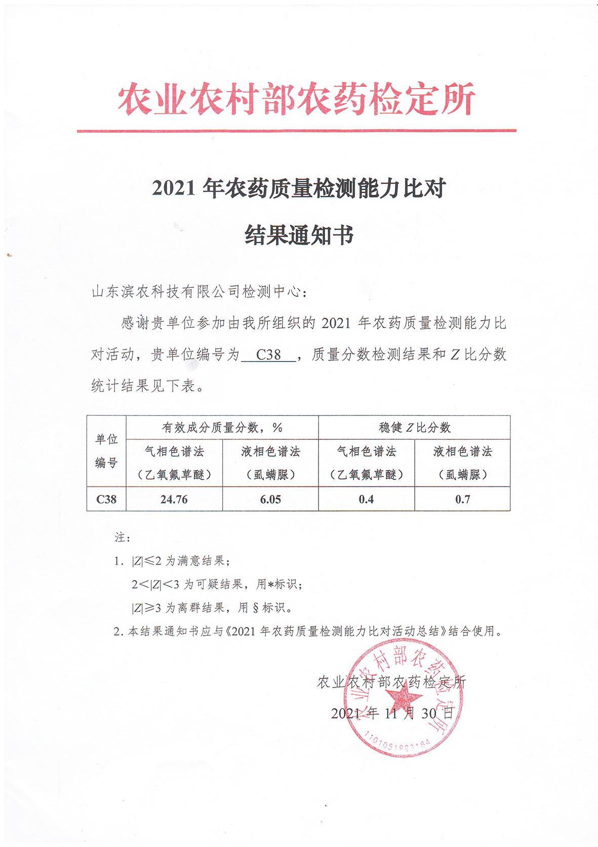 我公司取得2021年農(nóng)藥質(zhì)量檢測(cè)能力比對(duì)活動(dòng)優(yōu)異成績(jī)發(fā)布時(shí)間:2022-01-07 16:45為進(jìn)一步加強(qiáng)實(shí)驗(yàn)室管理,提高農(nóng)藥產(chǎn)品質(zhì)量檢測(cè)能力,今年5月,農(nóng)業(yè)農(nóng)村部農(nóng)藥檢定所組織開展了2021年農(nóng)藥質(zhì)量檢測(cè)能力比對(duì)活動(dòng),126家具有農(nóng)藥質(zhì)量檢測(cè)能力的科研、生產(chǎn)、試驗(yàn)、檢驗(yàn)檢測(cè)等單位參加,11月30日,接比對(duì)活動(dòng)結(jié)果通知,我公司順利通過2021年農(nóng)藥質(zhì)量檢測(cè)能力比對(duì)考核。此次檢測(cè)活動(dòng)隨機(jī)分為A、B、C共3組,數(shù)據(jù)處理采用穩(wěn)健統(tǒng)計(jì)方法,分別對(duì)氣相色譜法乙氧氟草醚和液相色譜法虱螨脲質(zhì)量分?jǐn)?shù)檢測(cè)結(jié)果進(jìn)行統(tǒng)計(jì)學(xué)處理。我公司實(shí)驗(yàn)室編號(hào)為C38,穩(wěn)健Z比分?jǐn)?shù)乙氧氟草醚為0.4,虱螨脲為0.7,與參加活動(dòng)的其他單位比較,處于本次比對(duì)中的上游水平。此次能力比對(duì)活動(dòng)有力檢閱并推進(jìn)了我公司檢測(cè)技術(shù)能力得提升。 ![]() |