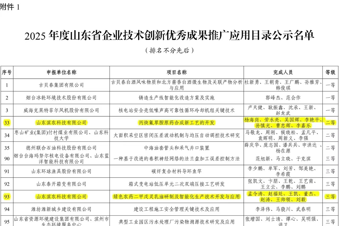 我公司兩項成果斬獲2025年度山東省企業(yè)技術創(chuàng)新優(yōu)秀成果獎發(fā)布時間:2025-10-14 10:52 9月12日,山東省企業(yè)技術創(chuàng)新促進會正式公布了2025 年度山東省企業(yè)技術創(chuàng)新優(yōu)秀成果推廣應用目錄,我公司憑借在綠色農(nóng)藥研發(fā)與工藝創(chuàng)新領域的突破成果斬獲兩項省級榮譽——“丙炔氟草胺原藥合成新工藝的開發(fā)”獲評二等獎,“綠色農(nóng)藥二甲戊靈乳油研制及智能化生產(chǎn)技術開發(fā)與應用”榮獲三等獎,彰顯了我公司在技術創(chuàng)新領域的強勁實力與行業(yè)競爭力。 ![]() |