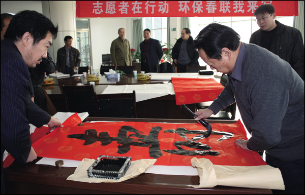 1月29日上午,由濱州市環(huán)保局、環(huán)保協(xié)會聯(lián)合舉辦,我公司冠名贊助的環(huán)保春聯(lián)有獎?wù)骷攥F(xiàn)場書寫在我銷售公司三樓會議室隆重開展。濱州市環(huán)保協(xié)會邀請我市書法協(xié)會主席孫樹勛先生等八位書法家,義務(wù)參加“志愿者在行動,環(huán)保春聯(lián)我來寫”活動,現(xiàn)場潑墨揮毫,書寫環(huán)保春聯(lián)一百多幅,墨香氤氳的和諧場面,暗合了“青山環(huán)北郭,綠水繞東城”的美好和諧意境。