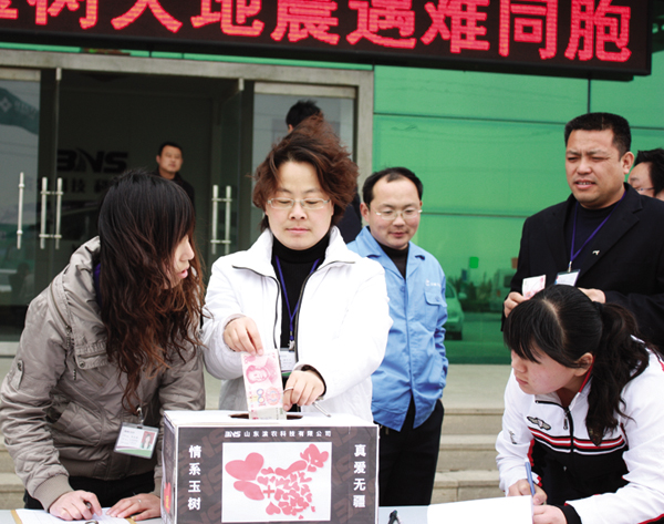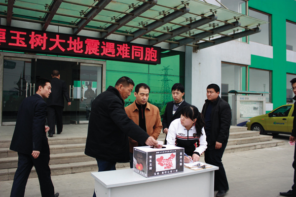 4·14青海玉樹地震發(fā)生后,我公司全體干部員工十分關(guān)注來自災(zāi)區(qū)的一切消息。4月21日上午10時,值此全國哀悼日,我公司黨總支、工會組織了“情系玉樹,真愛無疆”自愿捐款活動,集團(tuán)董事長黃延昌、總經(jīng)理任立明率先捐款,全體高中層干部在辦公樓前參加了集體捐款活動。集團(tuán)公司各部門、車間員工也紛紛自發(fā)捐款,集中將善款交到了企業(yè)文化部。活動結(jié)束后,累計捐款近五萬元,這批善款將用于馳援災(zāi)區(qū)同胞抗震救災(zāi),重建家園。